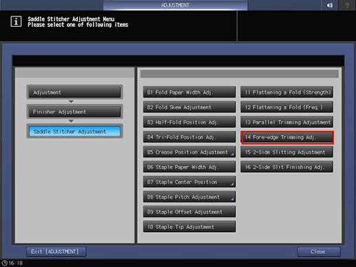 Press [Finisher Adjustment], [Saddle Stitcher Adjustment], and [Fore-edge Trimming Adj.] in sequence.
