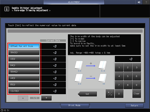 Adjust the cut edge trimming width for Saddle Stitcher SD-513. The trimming width should be more than 5 mm, otherwise the trimming operation may not performed properly.
