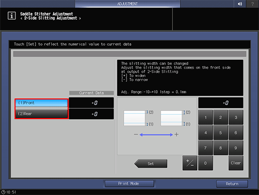 Adjustment Range: -10 ([To narrow]) to +10 ([To widen]) (1 step = 0.1 mm)