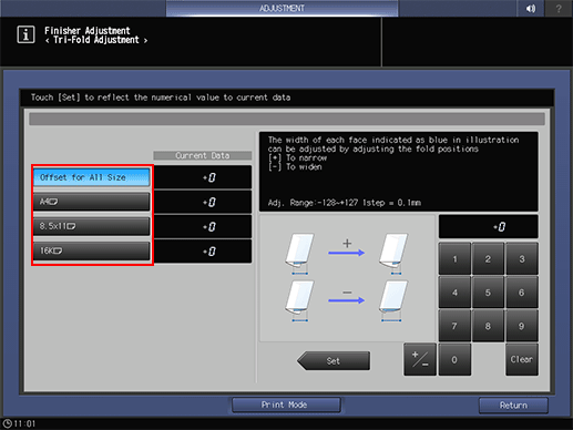 When using Finisher FS-612, adjust the Fold 1 position in Tri-Fold mode.