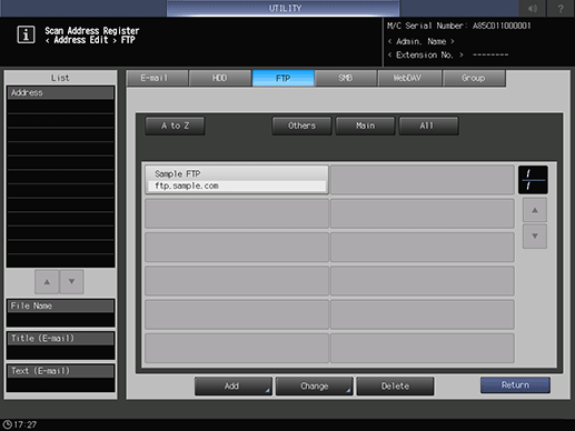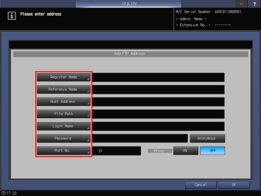 Enter information of a destination on the [Add FTP Address] screen. Pressing each item displays each screen to enter characters.