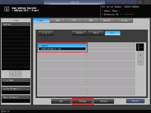 Press [E-mail], [HDD], [FTP], [SMB], [WebDAV], or [Group] to display a destination to change its information.