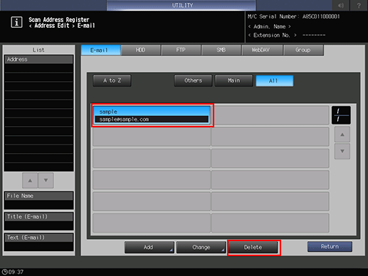 Press [E-mail], [HDD], [FTP], [SMB], [WebDAV], or [Group] to display a destination to delete.