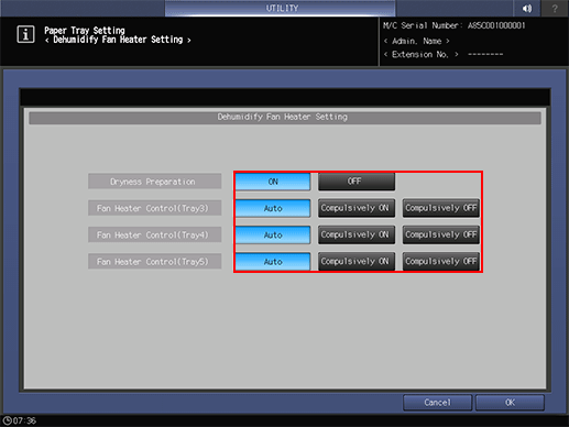 If Large Capacity Unit LU-202m or Large Capacity Unit LU-202XL is mounted with Dehumidifier Heater HT-503; Paper Feeder Unit PF-602m is mounted with Dehumidifier Heater HT-504 or Dehumidifier Heater HT-505; or Paper Feeder Unit PF-707 or Paper Feeder Unit PF-707m is mounted with Dehumidifier Heater HT-506, set the Dryness Preparation ON/OFF option and the automatic/compulsive fan heater ON/OFF option for each tray.