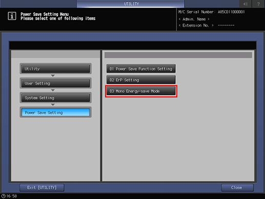 Press [System Setting] on the [User Setting Menu] screen, and then press [Power Save Setting] and [Mono Energy-save Mode] in sequence.
