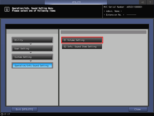 2. Press [System Setting] on the [User Setting Menu] screen, and then press [Operation/Info. Sound Setting] and [Volume Setting] in sequence.
