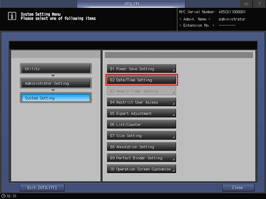 2. Press [System Setting] on the [Administrator Setting Menu] screen, and then press [Date/Time Setting].
