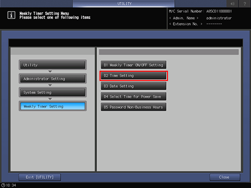 2. Press [System Setting] on the [Administrator Setting Menu] screen, and then press [Weekly Timer Setting] and [Time Setting] in sequence.