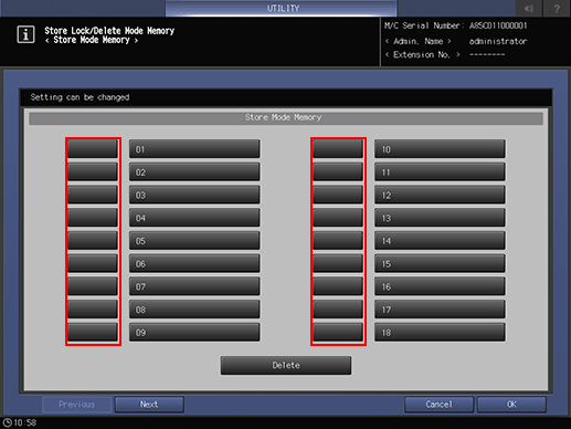 Press [System Setting] on the [Administrator Setting Menu] screen, and then press [Restrict User Access], [Lock/Delete Mode Memory], and [Store Mode Memory] in sequence.