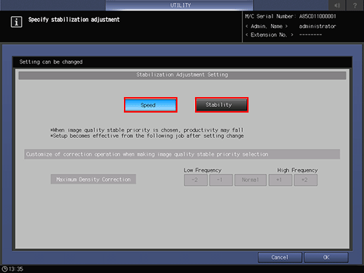 Select which to prioritize, print speed or image quality stability, for jobs. When you select image quality stability, set the frequency of maximum density correction for each item.