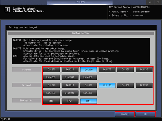 Dot 120 is recommended for the Screen 1. We recommended to use Screen1 for usual operation. If necessary, specify the screen setting to Screen 2 or Stochastic according to your printing task.