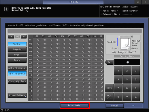 • For manual setting of the density balance adjustment, the following two modes, [All x 9 points] and [16 x 32 points], are provided.