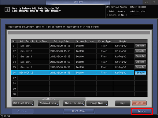 The screen returns to the [Density Balance Adj. Data Register/Del] screen and [NEW PROFILE] in [Adj. Data Profile Name] is displayed.