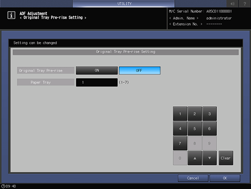 The [Original Tray Pre-rise Setting] screen is displayed.
