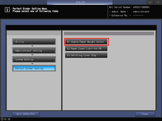 Press [System Setting] on the [Administrator Setting Menu] screen, and then press [Perfect Binder Setting] and [Usable Paper Weight Select] in sequence.