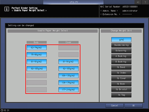 If one of the paper weight selected here is not specified for the tray to be used in perfect binding, the binding operation will become unavailable with an "unsuitable" message displayed.