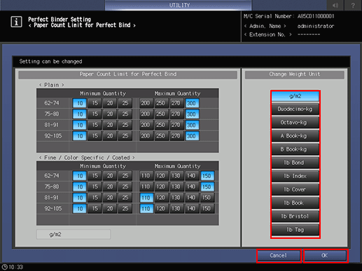 To cancel the change, press [Cancel]. In either case, the screen returns to the [Perfect Binder Setting Menu] screen.
