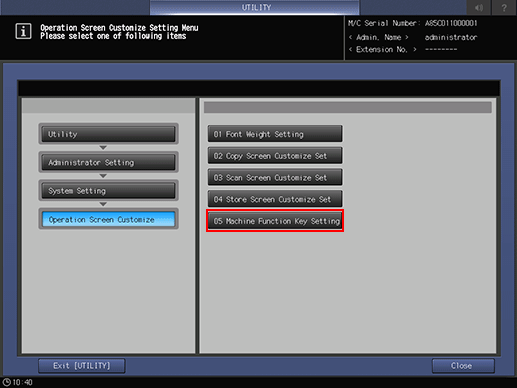 2. Press [System Setting] on the [Administrator Setting Menu] screen, and then press [Operation Screen Customize] and [Machine Function Key Setting] in sequence.