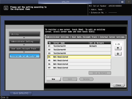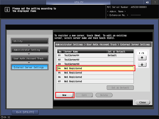 Select an unregistered (or blank) line on the [External Server Settings] screen, and press [New] to register a new external server.
