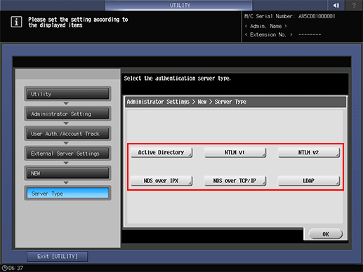 Press one of the following options to configure the details: [Active Directory], [NTLMv1], [NTLMv2], [NDS over IPX], [NDS over TCP/IP], and [LDAP].