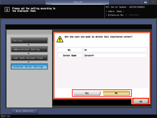 Select a line on the External Server Setting screen and press [Delete] to delete data for the registered external server.