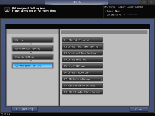 Press [Security Setting] on the [Administrator Setting Menu] screen, and then press [HDD Management Setting] and [Delete Temp. Data Setting] in sequence.