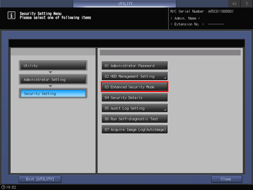• To turn the Enhanced Security mode ON, the service representative should set a CE authentication password and administrator password on the machine. From the UTILITY screen, go to [Administrator Setting] - [Security Setting] - [HDD Management Setting] - [HDD Encryption Setting] and change to [ON].