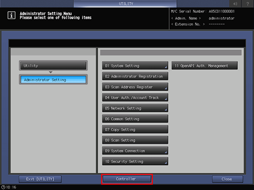 • Only when the machine is mounted with Image Controller IC-603, the [Controller] key on the [Administrator Setting Menu] screen, accessed from the [UTILITY] screen, is displayed and available.