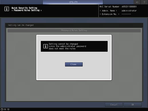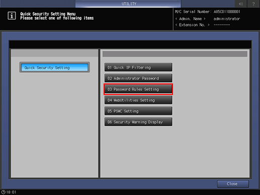 2. Press [Password Rules Setting] on the [Quick Security Setting Menu] screen.