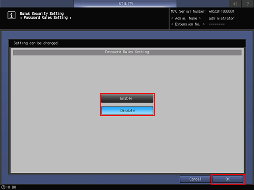 Selecting [Enable] sets the machine to accept passwords specified more strictly than usual, according to the password rules as described below.