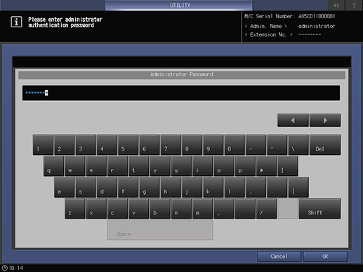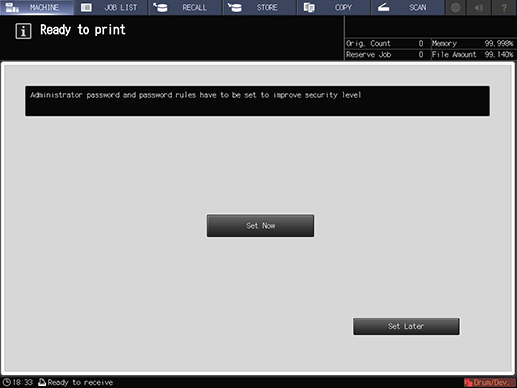 If pressing [Set Now] displays the [Administrator Password] screen, press [Cancel]. The default screen is displayed, you can use the machine normally.