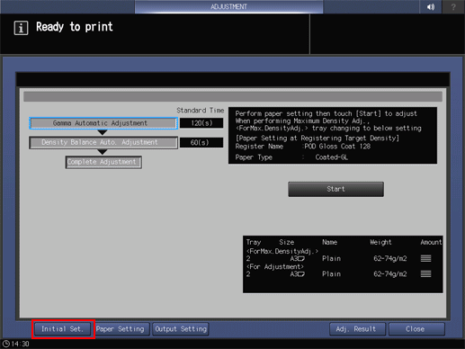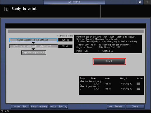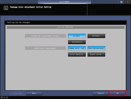 Change any setting (Screen of Adjustment Target, Additional Adjustment, Maximum Density Adjustment Tray, or Adjustment Tray), then press [OK].
