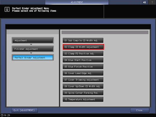 Press [Finisher Adjustment], [Perfect Binder Adjustment], and [Clamp CD Width Adjustment] in sequence.