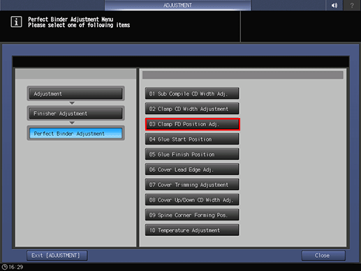 Press [Finisher Adjustment], [Perfect Binder Adjustment], and [Clamp FD Position Adj.] in sequence.
