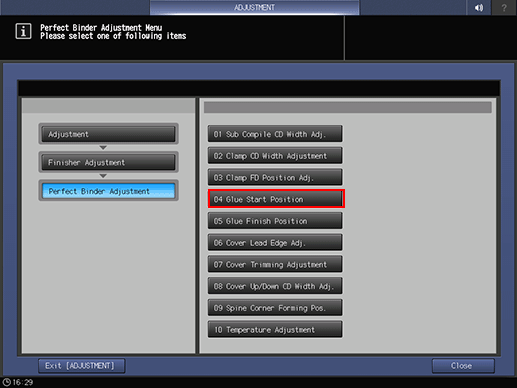 Press [Finisher Adjustment], [Perfect Binder Adjustment], and [Glue Start Position] in sequence.