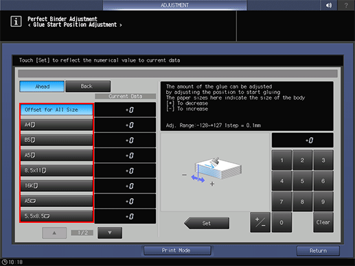 If a numeric value is specified for [Offset for All Size], it is applied to all paper sizes. With a specific paper size selected,the set value becomes the sum of the entered value and the value previously specified for [Offset for All Size].