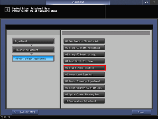 Press [Finisher Adjustment], [Perfect Binder Adjustment], and [Glue Finish Position] in sequence.