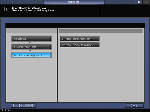 Press [Finisher Adjustment], [Relay Stacker Adjustment], and [Paper Length Adjustment] in sequence.