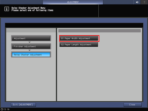 Press [Finisher Adjustment], [Relay Stacker Adjustment], and [Paper Width Adjustment] in sequence.