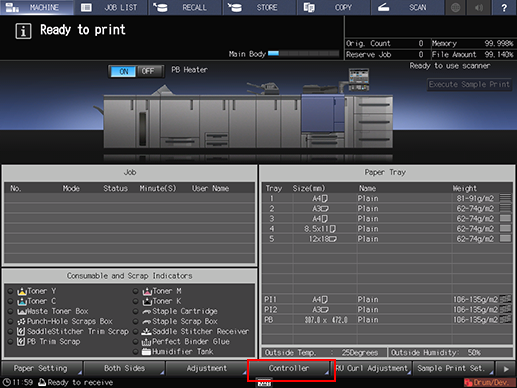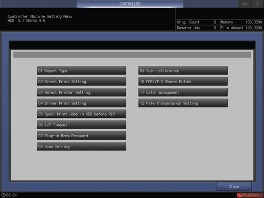 Press [Controller] to display the [Controller Machine Setting Menu] screen. The [Controller Machine Setting Menu] screen enables you to make various settings and to check the job status.