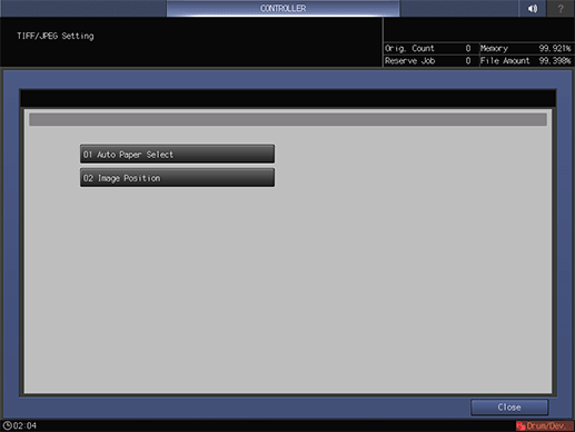 This screen is displayed if you select [Direct Print Setting] - [TIFF/JPEG Setting] in the [Controller Machine Setting Menu] screen. For details about how to display the [Controller Machine Setting Menu] screen, refer to CONTROLLER: Setting the Controller.