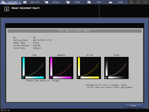 Press [Color Dens. Result] on the [MACHINE] screen to display the [Color Density Control Result] screen.