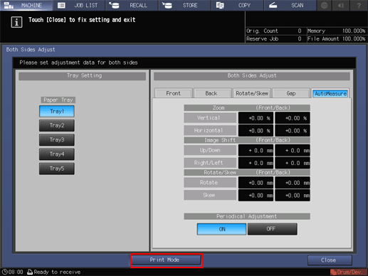 Press [AutoMeasure], then press [Print Mode], after selecting the tray loaded with paper for adjustment.