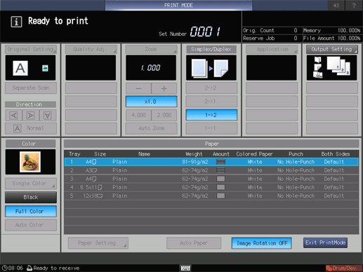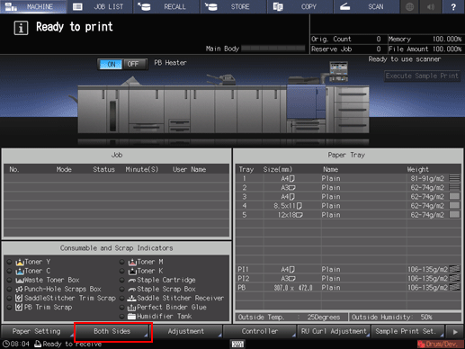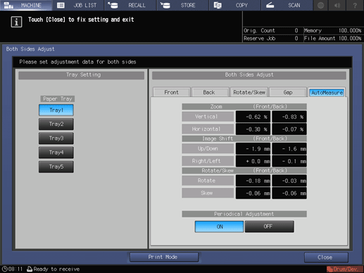If you press [Adjustment] - [Quality Adjustment] - [Periodical Both Sides Adj.] on the [MACHINE] screen and set [Period. Both Sides Auto Adj.] to [ON], you can set [Periodical Adjustment] to [ON] or [OFF] for each tray. [Periodical Adjustment] is available for the tray for which [ON] is set. For details, refer to Periodical Both Sides Adj..