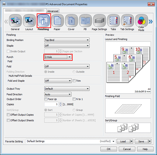 Setting [Punch] on the [Finishing] tab allows you to make punch holes (2 holes, 3 holes, 4 holes, or Swedish 4 holes). Mount Punch Kit PK-522 to Finisher FS-532.