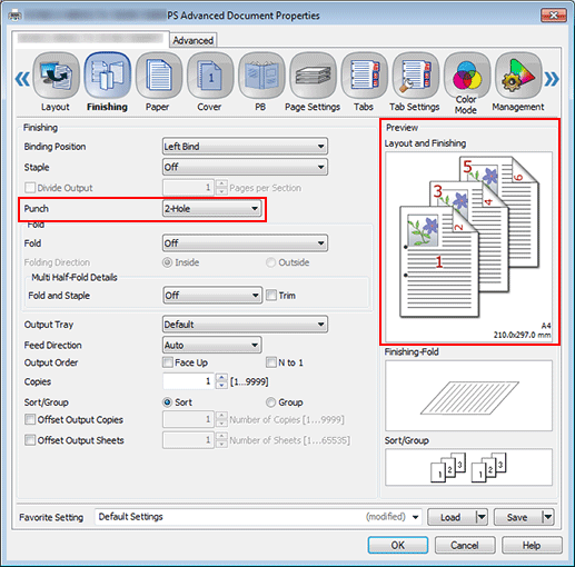 Setting [Punch] allows you to make punch holes (2 holes, 3 holes, 4 holes, or Swedish 4 holes). Mount Punch Kit PK-522 to Finisher FS-532.