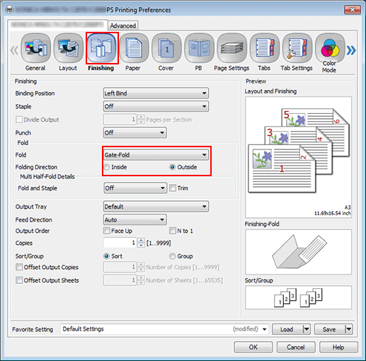 Click the [Finishing] tab, and then set [Fold] and [Folding Direction].