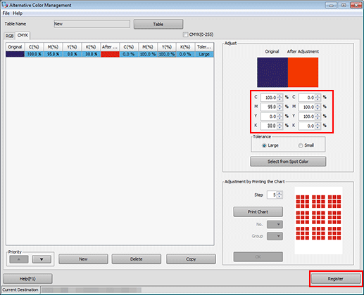 The colors being set are displayed under [Adjust]. Color in [Original] indicates the source CMYK color while the color in [After Adjustment] indicates the alternative color.