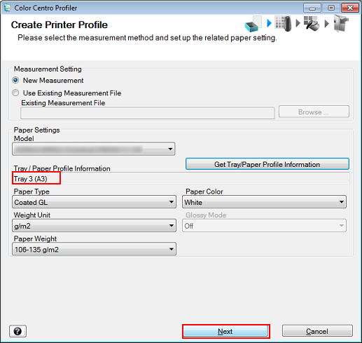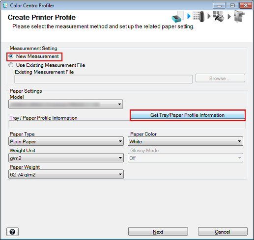 Select [New Measurement] under [Measurement Setting] and click [Get Tray/Paper Profile Information].