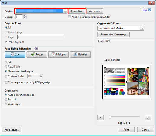 Select the printer to use for printing and click [Properties].